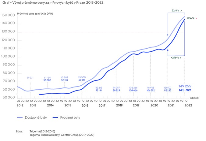 Ceny nových bytů v hlavním městě nadále rostou. Průměrná prodejní cena v Praze dosáhla v letošním prvním čtvrtletí 145 749 Kč/m2. To je o téměř 30 procent více než před rokem. Na vině je především nízká nabídka, která se již téměř rok pohybuje jen okolo 3 tisíc nových bytů, a prudce rostoucí ceny vstupů, především stavebních prací, materiálů a energií. Za první tři měsíce letošního roku se prodalo 1050 nových bytů. Vyplývá to z analýzy společností Trigema, Skanska a Central Group.