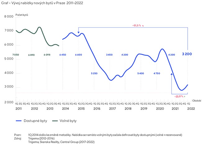 Na konci prvního čtvrtletí si zájemci o nové bydlení mohli vybírat jen asi z 3200 nových bytů. Oproti stejnému období loňského roku tak měli na výběr o 1000 bytů (24 %) méně. Nabídku nových bytů se kvůli komplikovaným povolovacím procesům dlouhodobě nedaří v potřebném množství doplňovat. Počet nových volných bytů v hlavním městě se již rok drží jen kolem úrovně 3 tisíc, přitom dříve bylo v cenících běžné dvojnásobné množství.