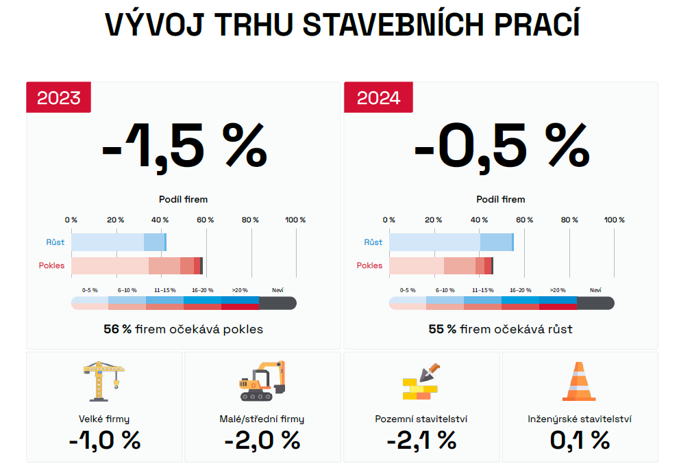 V následujících měsících podle oslovených ředitelů stavebních firem nelze čekat zásadní oživení trhu a bude pokračovat pokles stavební produkce. V letošním roce stavební firmy očekávají pokles trhu o −1,5 % a pro rok 2024 se pak čeká lehce klesající trend až stagnace trhu na hodnotě –0,5 %.