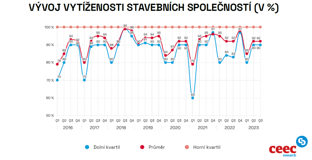 Kapacity stavebních společností pokračují stále v poměrně vysoké úrovni vytížení (92 %). Vysoká kapacitní vytíženost je v této době, kdy jsou predikce směřovány spíše směrem dolů, dána několika faktory. Jedním z faktorů jsou kontrakty, které byly nasmlouvány z dřívějších let, dalším je nedostatek pracovní síly, neboť i přes snahu stavebních společností na pracovním trhu není možné sehnat kvalifikovanou pracovní sílu, a tím rozvíjet své kapacity.