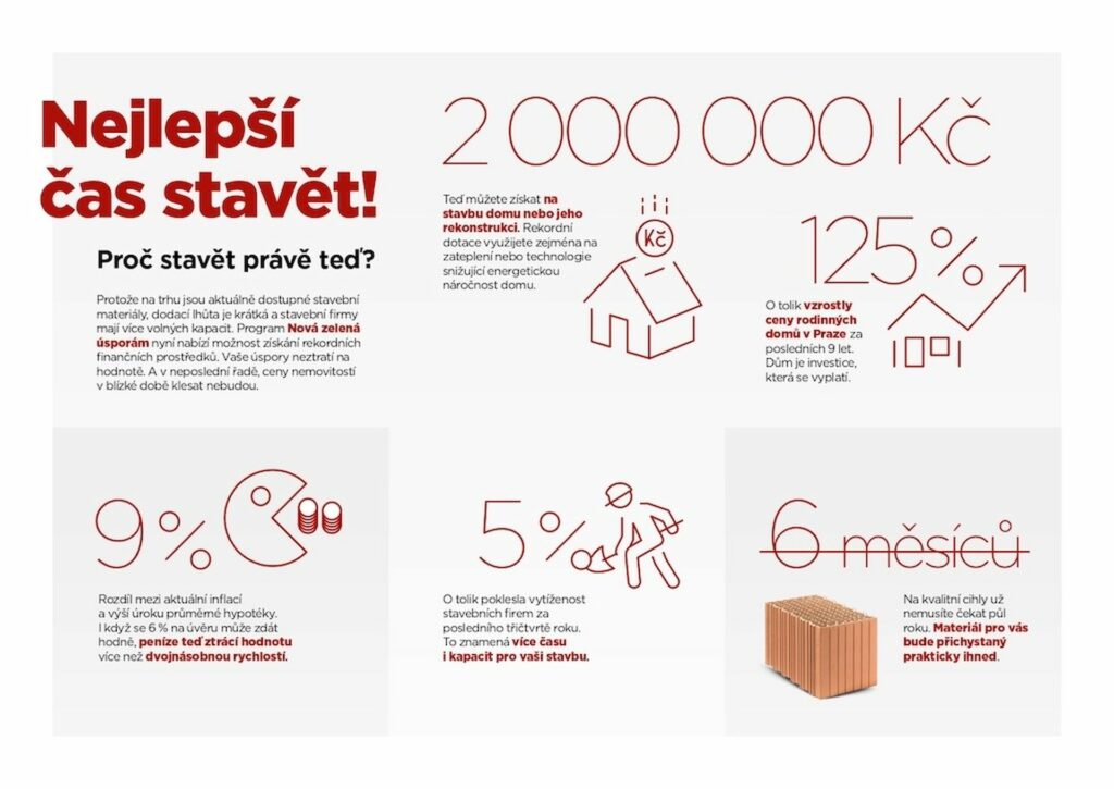 Už od září startuje další kolo dotací Nová zelená úsporám od Ministerstva životního prostředí. Program bude nejen dostupnější, ale lze získat rekordní objemy peněz. Investor může celkem zažádat o dotaci do výše až 2 milionů korun. Příspěvek se vztahuje jak na zateplení takzvaného “domu po babičce,” (výměna obvodového zdiva, zateplovací systémy, obnova střešního pláště, oken a stínící techniky), tak na obnovitelné zdroje energie (fotovoltaické systémy, rekuperační jednotky, kotle, kamna a tepelná čerpadla), nebo i využití dešťové vody a například i nabíjecí stanici pro elektromobily. Mladé rodiny mohou k tomu všemu obdržet i bonus 50 tisíc korun na každé nezaopatřené dítě, ve stejné výši bonus na zpracování projektu nutného pro podání žádosti o čerpání dotace a bonus 10 tisíc korun za kombinaci více opatření. Domácnosti z Karlovarského, Moravskoslezského, Ústeckého kraje a z obcí podporovaných státem, zase získají bonus 10 % z celkové výše dotace. Své si najdou ale i investoři novostaveb, kteří mohou zažádat o finanční příspěvek v rozmezí od 200 tisíc do 500 tisíc korun a k tomu ještě až 35 tisíc na projektovou přípravu domu. Zákazník navíc může vzhledem k volným kapacitám na trhu realizovat stavbu v krátkém časovém období.