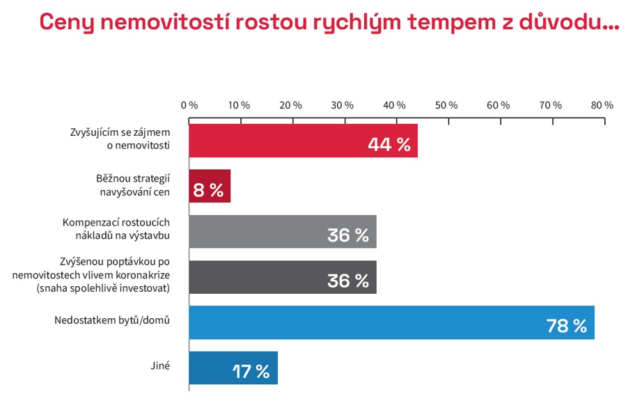 Podle EUROSTAT je růst cen rezidenčních nemovitostí v ČR pátým nejvyšším z celé Evropské unie. Tento fakt je dle dotázaných developerských společností dán nedostatkem bytů a domů (78 %) a zvyšujícím se zájmem o nemovitosti (44 %). Mezi další důvody developeři řadí kompenzaci rostoucích nákladů na výstavbu a zvýšenou poptávku po nemovitostech vlivem koronakrize – snaha spolehlivě investovat (obojí shodně 36 %). Dále je důvodem zvyšování cen běžná strategie navyšování cen (8 %) či jiné důvody než výše uvedené (17 %).