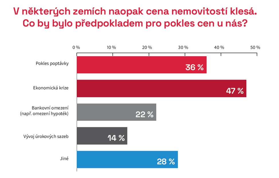 V některých zemích naopak cena nemovitostí klesá. Předpokladem pro pokles cen u nás by dle 47 % dotázaných developerů byla ekonomická krize. Dalších 36 % oslovených zmiňuje, že pokles cen by způsobil pokles poptávky. Dále 22 % uvedlo jako důvod bankovní omezení (např. omezení hypoték), 14 % vývoj úrokových sazeb a 28 % uvádělo jiné důvody než výše uvedené, jako je např. rychlejší povolování nových staveb, pokles cen stavebních prací nebo zvýšení nabídky nemovitostí.