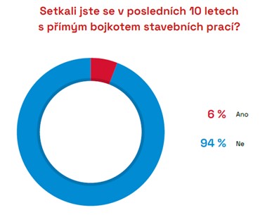 S přímým bojkotem staveb, kdy docházelo např. k poškozeni strojů nebo k fyzickému bránění ve výstavbě, se v posledních 10 letech setkalo 6 % dotázaných stavebních firem. Naopak 94 % takovou zkušenost nemá. Stavební firmy uváděly také jiné možnosti, než jsou výše uvedené, mezi které patřily například ochota investora ke komunikaci nebo srozumitelná zadávací podmínky (3,6 bodu z 10 možných).