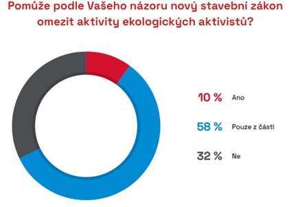 Podle 58 % dotázaných společnosti pomůže novy stavební zákon omezit aktivity ekologických aktivistů pouze z části. Podle 32 % dotázaných tyto aktivity nepomůže omezit vůbec. Opačného názoru je pouze 10 % z dotázaných.