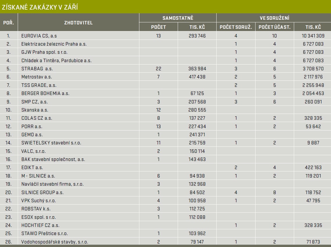 Veřejné zakázky na stavební práce získalo v září jako samostatní zhotovitelé či jako členové sdružení zhotovitelů celkem 331 subjektů. Jednotlivým individuálním zhotovitelům bylo zadáno 412 zakázek za 7982 mil. Kč a sdružením zhotovitelů 46 zakázek za 15 124 mil. Kč. Největší objem veřejných stavebních zakázek v září získala společnost EUROVIA CS a.s. samostatně 13 zakázek v úhrnné hodnotě 293 746 tis. Kč (včetně DPH) plus podíl z hodnoty 10 341 309 tis. Kč (včetně DPH) získaný ve čtyřech sdruženích.