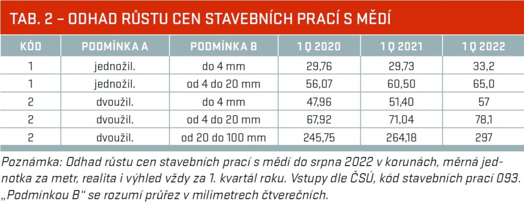 Cena mědi spolu s cenami stavební oceli jsou hlavními ukazateli stavu trhu průmyslových produktů, jeho oživování. Cenovou hladinu červeného kovu svou poptávkou ovlivňuje náš resort málo. Cenu mědi zvedá svou poptávkou automobilový průmysl, orientující se na elektromobily. Stavebních prací se nicméně hladina ceny mědi dotkla. V odvětví se barevný kov užívá na klempířské práce při restauracích památkových objektů, na střešní konstrukce, okapy, na dálková vedení různých elektrozařízení, rozvody (viz tab. 2).