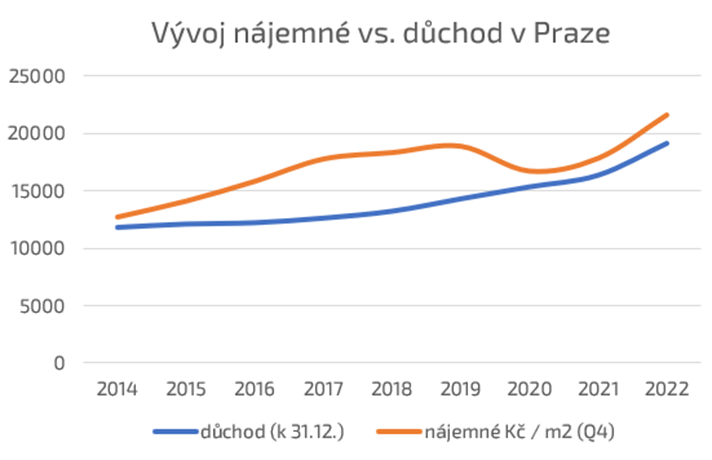 „Situaci dobře ilustruje srovnání výše starobního důchodu a nájemného. V Praze byl loni průměrný důchod 19.173 Kč měsíčně. To při současné výši měsíčního nájemného, které činí v metropoli zhruba 400 Kč za m², stačí jen na pronájem garsonky. Průměrnému pražskému důchodci pak nezbudou téměř žádné peníze na další výdaje. Proto je lepší se na nájemní bydlení do budoucna nespoléhat,“ vysvětluje výkonná ředitelka Central Group Michaela Tomášková.