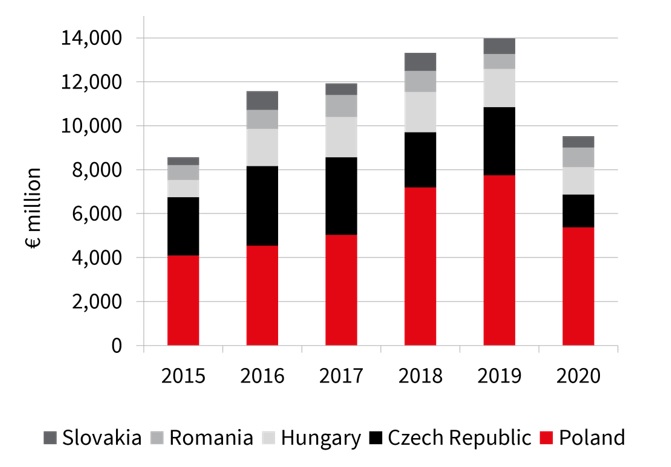 Objem investic do nemovitostí ve střední a východní Evropě v roce 2020 poklesl oproti předchozímu roku o 32 procent na 9,7 miliardy eur. Více než 57 % z této částky připadá na Polsko (5,6 miliard EUR), za kterým následují Česká republika (1,5 miliardy EUR), Maďarsko (1,25 miliard EUR), Rumunsko (900 milionů eur) Slovensko (cca 520 milionů EUR).