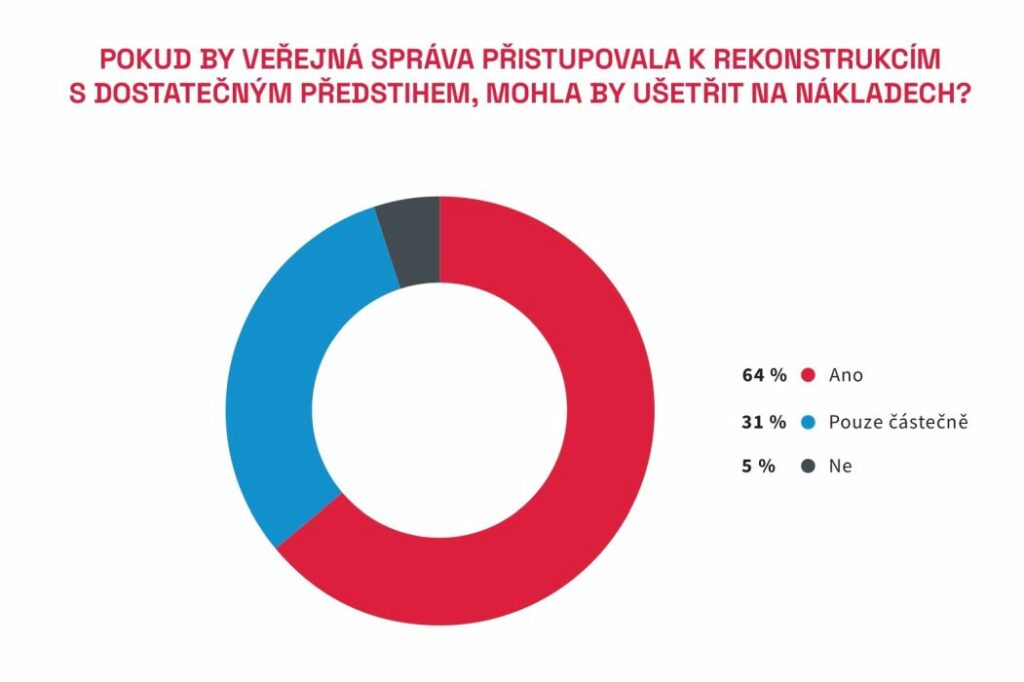 Podle dvou třetin dotázaných stavebních společností by veřejná správa mohla ušetřit na nákladech na rekonstrukci staveb, pokud by tyto zakázky zadávala včas (64 %). Téměř třetina je názoru, že by veřejná správa mohla ušetřit na takových zakázkách pouze z části (31 %). V průměru by se mohlo podle stavebních společností jednat o úsporu až 27 %. Podle 5 % dotázaných stavebních společností by včasné zadání nemělo na cenu zakázky vliv. „Obecně jsou stavby realizovány v horší kvalitě, projevující se v delším či kratším odstupu po dokončení, z hlediska pojišťovny však neevidujeme vyšší procento pojistných událostí u veřejných zakázek než u zakázek soukromých,“ doplňuje Libor Libich, ředitel útvaru korporátního obchodu společnosti Generali Česká pojišťovna a.s.