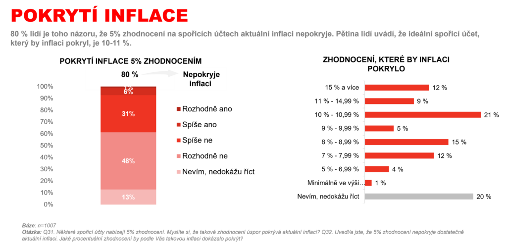 Při zjišťování celkového přehledu o ekonomické realitě nyní a v minulosti také vyplynulo, že v některých záležitostech mají Češi znalosti odpovídající nebo přibližující se skutečnému stavu. Například 80 procent lidí je přesvědčeno, že pětiprocentní zhodnocení úspor na spořicích účtech inflaci neporáží. Třetina lidí dál uvedla, že je aktuálně průměrná sazba na spořicích účtech od pěti do šesti procent. Pouze pětina lidí neví. Třetina si pak nedokázala ani vzpomenout, ani odhadnout, jaké sazby byly před 10 lety. Při dotazování na ideální spořicí účet, odpověděla pětina Čechů, že je to podle nich takový, který pokryje inflaci, s úrokem v rozmezí 10 až 11 procent.