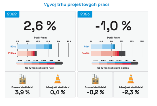 Pro letošní rok očekávají projektové společnosti vývoj trhu projektových prací ve výši 2,6 %. Pro rok 2023 počítají projektové společnosti s mírným poklesem, a to ve výši -1 %. „Projektové společnosti jsou v současné chvíli ohledně vývoje trhu optimistické. Veřejných zakázek je dostatek a společnosti mají maximálně vytížené kapacity. Na druhou stranu u některých společností panují obavy z dalšího vývoje trhu s ohledem na současnou krizi,“ komentuje aktuální situaci a vývoj Michal Vacek, výkonný ředitel společnosti CEEC Research s.r.o.