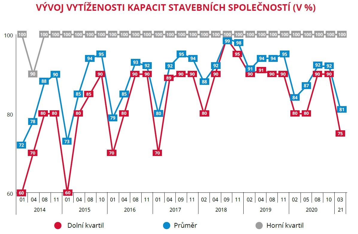 V současné chvíli jsou kapacity stavebních společností vytíženy na 92 %. V prvním kvartálu roku 2021 očekávají společnosti vytížení nižší, a to na 81 %.