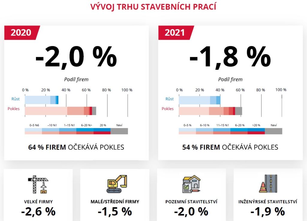 Stavební společnosti očekávají propad trhu v letošním roce o 2 % a v roce 2021 potom o dalších 1,8 %. Vyšší propad předpokládají velké stavební společnosti, a to o 2,6 % v letošním roce. Tržby stavebních společností budou v roce 2020 stagnovat, v příštím roce poklesnou o 1,3 %. Větší propad tržeb očekává pozemní stavitelství a malé stavební společnosti.