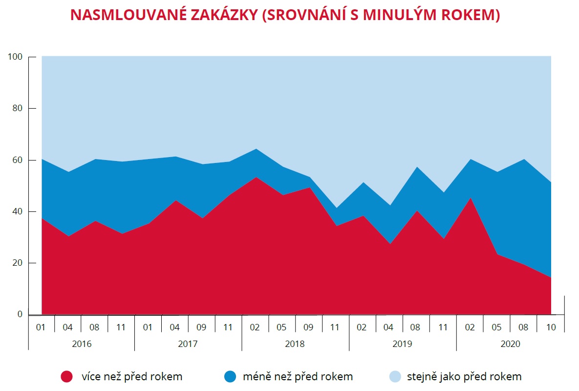Stavební společnosti mají nasmlouvané zakázky v průměru na osm měsíců dopředu. Pro téměř polovinu dotázaných to představuje stejně dlouhou dobu jako v tomtéž období minulého roku (49 %). Pro 37 % se potom jedná o zkrácení této doby v meziročním srovnání a pro 14 % tato doba představuje nárůst.