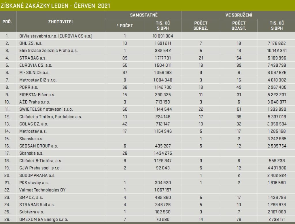Hodnota zadaných zakázek v lednu – červnu je tažena státními zakázkami dopravního stavitelství především zadáním pěti dílčích stavebních zakázek v úhrnné kalkulované hodnotě 10 091 mil. Kč, které budou realizovány společností DIVia stavební s.r.o., 100% dceřinou společností EUROVIA CS a.s. v rámci veřejné zakázky na PPP projekt Projektování, výstavba, financování, provozování a údržba dálnice D4 v úseku Háje–Mirotice a provozování a údržba existujících přiléhajících úseků Skalka– Háje a Mirotice–Krašovice, projekt PPP, která byl zadána ministerstvem dopravy francouzskému konsorciu DIVia D4, s.r.o. za komplexní cenu 38 660 mil. Kč s DPH.