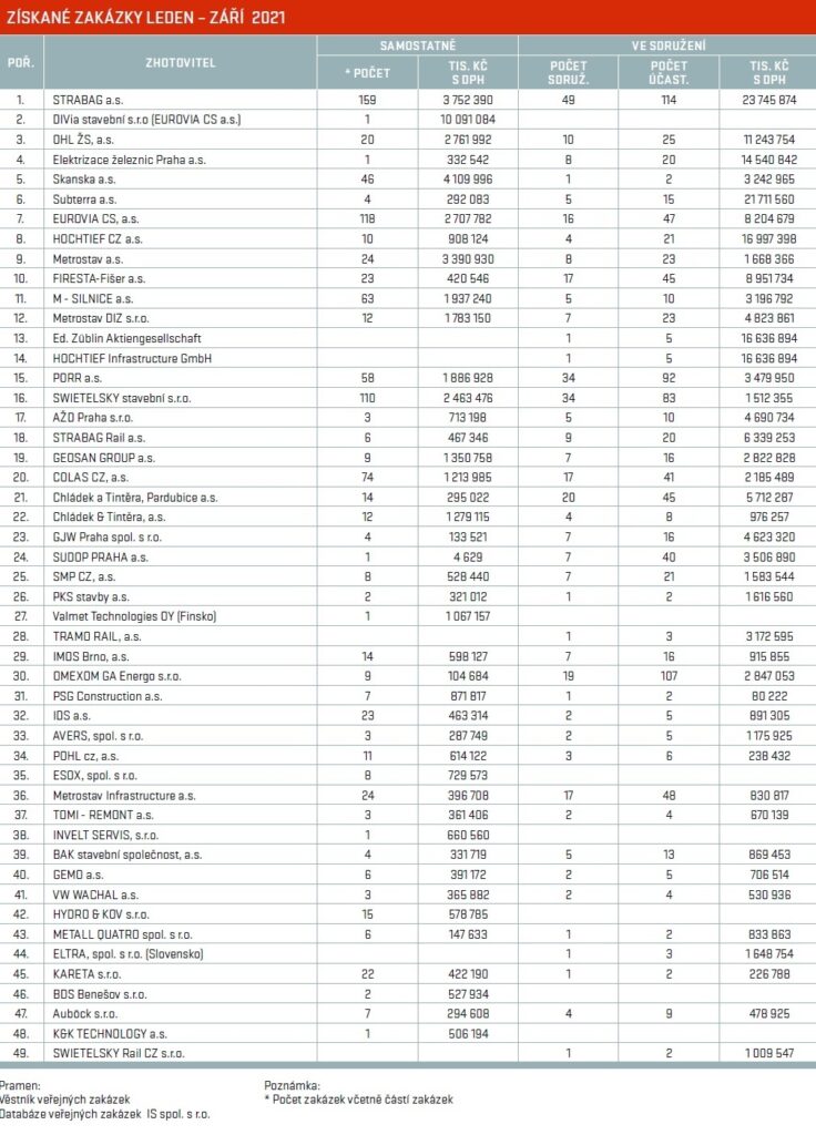 Největší objem veřejných stavebních zakázek od začátku roku do konce září získala společnost STRABAG a.s., samostatně 95 zakázek v úhrnné hodnotě 3 752 390 tis. Kč (včetně DPH) plus podíl z hodnoty 23 745 874 tis. Kč (včetně DPH) získaný v 49 sdruženích. Při započtení kalkulované ceny zakázky na dostavbu dálnice D4 získané společností DIVia stavební s.r.o., 100% dceřiné společnosti EUROVIA CS, a.s., byla nejúspěšnější společností z hlediska hodnoty získaných zakázek EUROVIA CS, a.s.