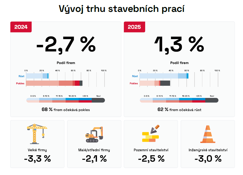 Vývoj trhu stavebních prací se aktuálně propadá. Meziroční srovnání stavební produkce je vypočteno z posledních dvanácti měsíčních indexů ČSÚ (klouzavý rok za 12 měsíců zpětně). Trh stavebních prací aktuálně představuje pokles −1,5 %. Inženýrské stavitelství meziročně klesá dokonce o 4,6 %, zatímco pozemní stavitelství stagnuje (−0,3 %). Je to horší vývoj, než vykazuje průměrně produkce stavebnictví v Evropě. Z mírného růstu ke stagnaci směřuje srovnatelný index EU27, který je aktuálně na hodnotě +0,5 %, protože v uplynulých měsících stavebnictví meziročně ztrácelo ve většině evropských zemí.