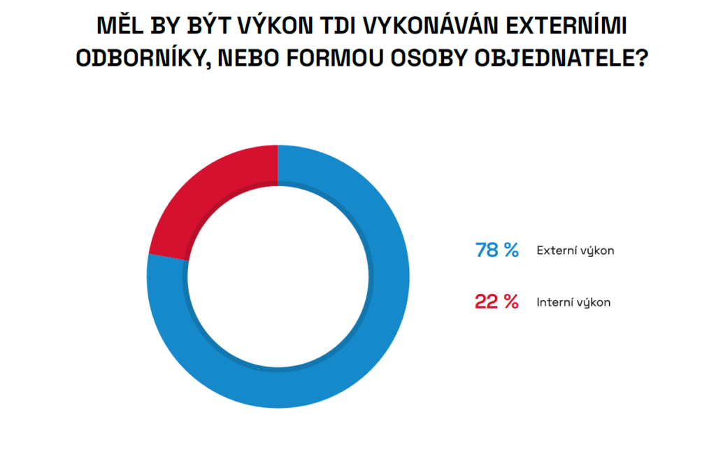 Téměř čtyři pětiny ředitelů projektových společností (78 %) si ale myslí, že by výkon technického dozoru měl být vykonáván externími odborníky. Přínosem může být lepší přenos zkušeností z jiného prostředí. U veřejných zakázek to posiluje transparentnost řízení stavby a v případě komplikovaných zakázek se může stát výhodou také potřebná nezávislost pohledu. Zbylá část dotázaných (22 %) preferuje, pokud je výkon technického dozoru vykonáván interním zaměstnancem objednatele, který bývá hlouběji seznámen s očekáváním investora. „Směřujeme k optimalizaci zadávání technických dozorů na stavbách a k systému, který nám umožní vychovávat nové pracovníky,“ říká k tomu Radek Mátl, generální ředitel Ředitelství silnic a dálnic ČR, a pokračuje: „Není ale možné mít na všechno vlastní kapacitu, bez externího dozoru se velké investiční akce obejít nemohou. Je také velké portfolio staveb, které mají interního správce stavby a externí technický dozor.“
