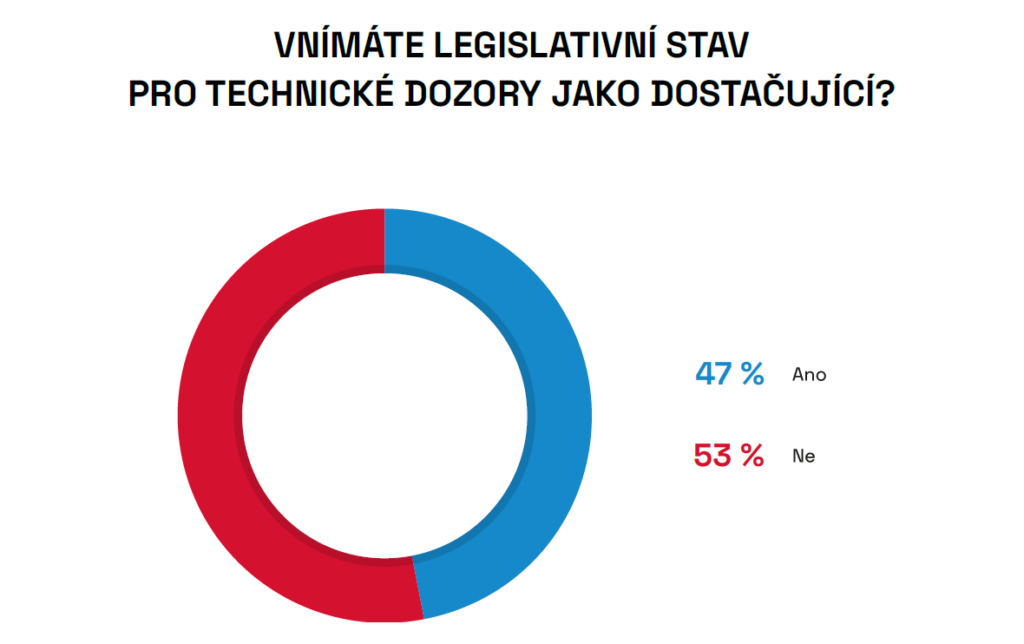 Postavení stavebního dozoru z pohledu zákonů je ale podle názorů lehce nadpoloviční většiny projektantů nedostatečné, nikoli z pohledu novely stavebního zákona, ale spíše s ohledem na živnostenský zákon nebo zákon o zadávání veřejných zakázek. Více jak polovina dotázaných (53 %) proto nevnímá aktuální legislativní stav pro technické dozory jako dostačující. Menší část dotázaných (47 %) vnímá naopak legislativní rámec pro technické dozory jako dostačující již nyní.
