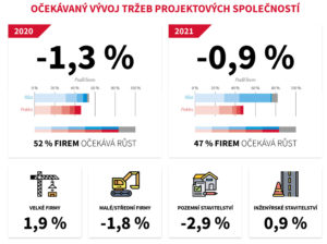 Celková situace na trhu se také promítne do tržeb projektových společností. Ty předpokládají pro rok 2020 celkový propad svých tržeb o 1,3 %. Další propad predikují také pro rok 2021, a to o 0,9 %. Při rozdělení na jednotlivé segmenty si opět můžeme všimnout rozdílných očekávání pozemní a inženýrské projekce. Zatímco inženýrská projekce pro letošní rok počítá stále s růstem svých tržeb o 0,9 %, projekce pozemních staveb již očekává pokles na straně tržeb, a to o 2,9 %. Pro následující rok 2021 již oba segmenty predikují pokles svých tržeb, a to o 1,1 % u firem zabývajících se projekcí pozemních staveb a o 0,6 % u společností zabývajících se projekcí staveb inženýrských.