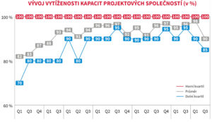 I přes očekávání poklesu trhu si ale společnosti drží vytížené kapacity téměř na maximum. V průměru projektové firmy uvádí vytížení svých kapacit až na 90 %.