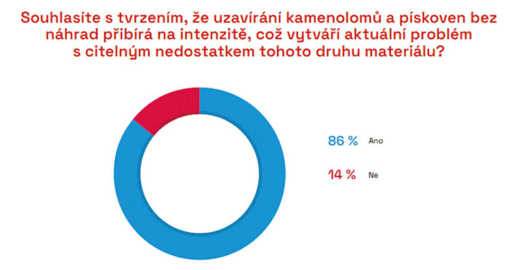Kamenolomy a pískovny jsou tématem, které rezonuje již několik let, ale podle ředitelů stavebních společností není tomuto problému věnována dostatečná pozornost. Výrazná většina stavebních společností (86 %) souhlasí s tvrzením, že uzavírání kamenolomů a pískoven bez náhrad přispívá k dlouhodobému problému s nedostatkem tohoto druhu materiálu. Pro stavební společnosti je rychlejší objednat si například kamenivo ze zahraničí, což dále prodražuje finální cenu stavby.