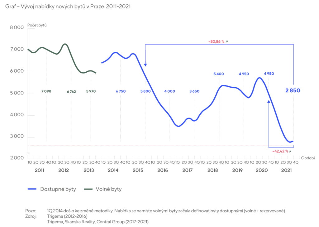 Ve 4Q 2021 bylo v nabídce 2 850 volných jednotek, což je o 100 volných bytů více než v předchozím čtvrtletí, ale v meziročním srovnání jde o pokles o 2 100 volných bytů. Oproti poslednímu čtvrtletí roku 2015 jde však o více než 50% pokles nabídky nových nemovitostí.