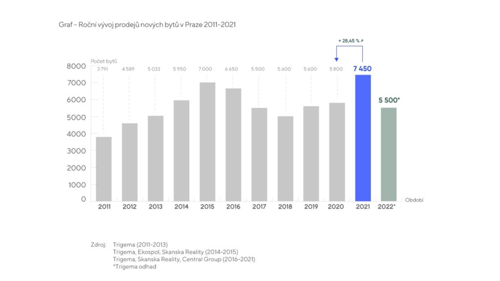 Enormní zájem o bydlení v hlavním městě, poháněný zejména snahou bezpečně uložit své úspory, stále ještě výhodnými úrokovými sazbami a přebytkem úspor v domácnostech, způsobil, že se v loňském roce prodalo historicky nejvíce bytů od roku 2011. Pro srovnání: v roce 2020 se prodalo v hlavním městě 5800 nových bytů, o rok dříve 5600 jednotek a v roce 2018 to bylo rovných 5000 bytů. Přesně sedm tisíc bytů se prodalo ve sledovaném období pouze v roce 2015.