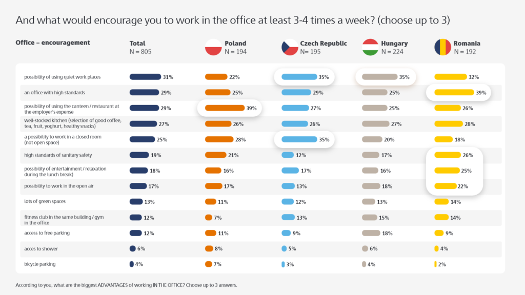 Jeden z faktorů, které by Čechy nejčastěji namotivovaly chodit do kanceláře minimálně tři dny v týdnu, je tiché místo pro práci. Platí to pro 35 % z nich. Stejná část by zároveň ocenila možnost pracovat v oddělené místnosti místo klasického open space.