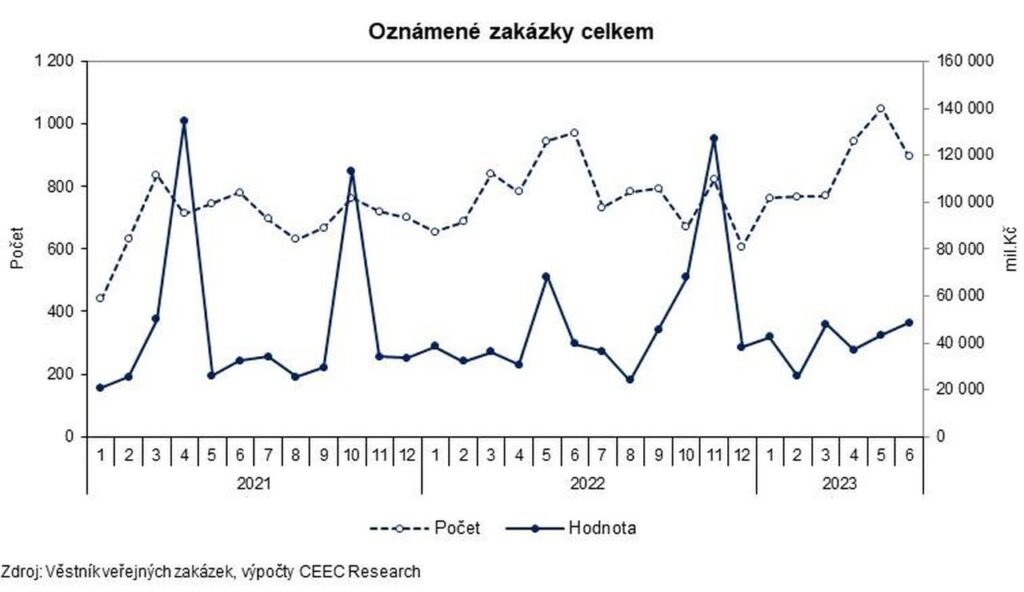 V 1. pololetí 2023 bylo vydáno 5 191 oznámení o veřejné zakázce, což ve srovnání se stejným obdobím předchozího roku představovalo růst o 6,3 %. Celková předpokládaná hodnota oznámení o zakázce činila 245,1 mld. Kč a byl zaznamenán její nepatrný růst o 0,1 %, což lze považovat spíše za stagnaci. Pokud bychom modelově posuzovali pouze zakázky s hodnotou pod 1 miliardu korun, dostaneme meziroční pokles hodnoty oznámených zakázek o 1,3 %.