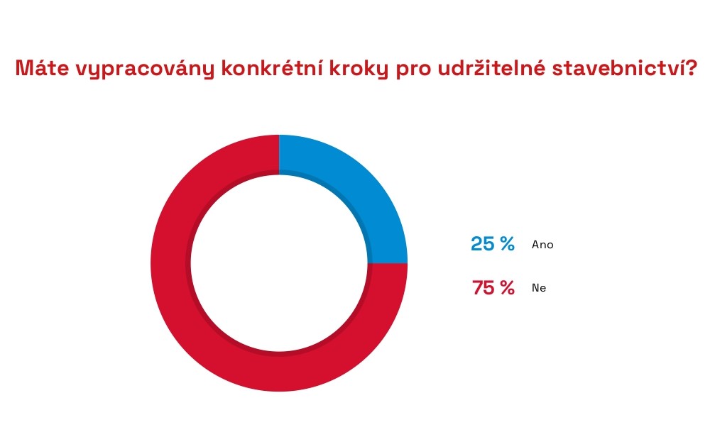 Pouze čtvrtina stavebních společností má v současné chvíli vypracovány konkrétní kroky pro udržitelné stavebnictví. Zbylých 75 % tyto kroky ještě vypracované nemá. Ačkoli můžeme odhadovat, že se trh bude brzy ubírat „zeleným“ směrem, stavební společnosti na tento trend prozatím ve většině nereagují.