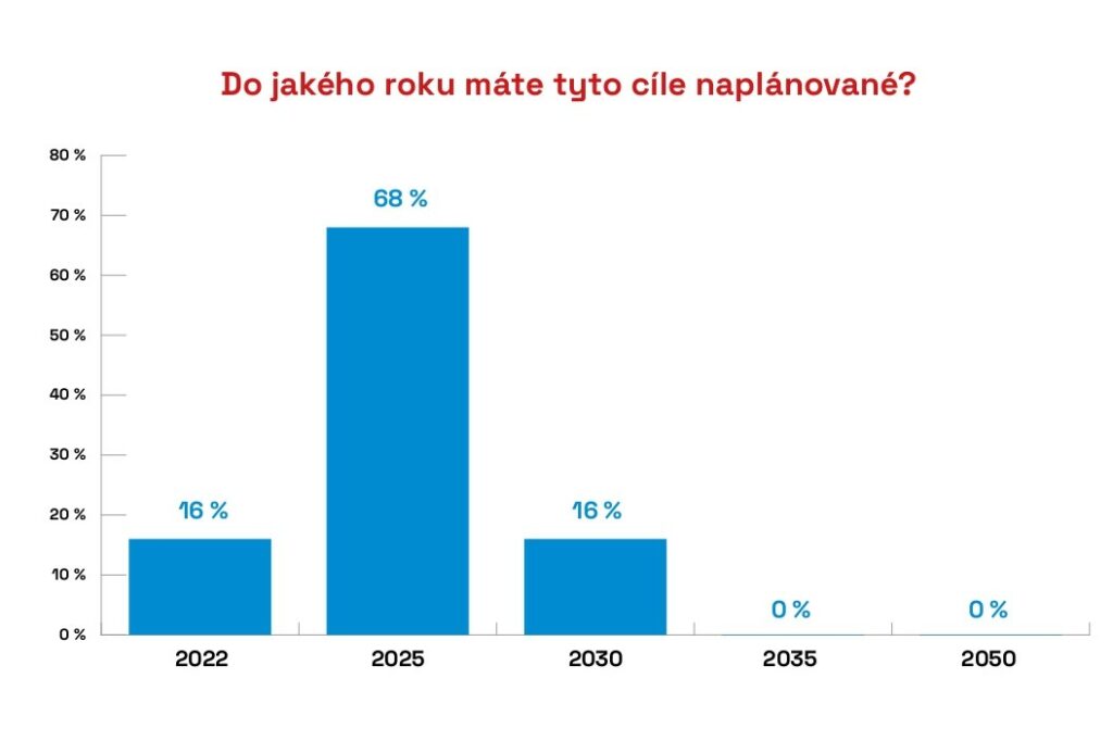Největší díl společností, a to 68 %, má své cíle naplánované do roku 2025. Dalších shodných 16 % do roku 2022 nebo do roku 2030. Pro životní prostředí je toto jistě dobrou zprávou a je zde vidět zájem společností co nejdříve přistupovat k postupným změnám.