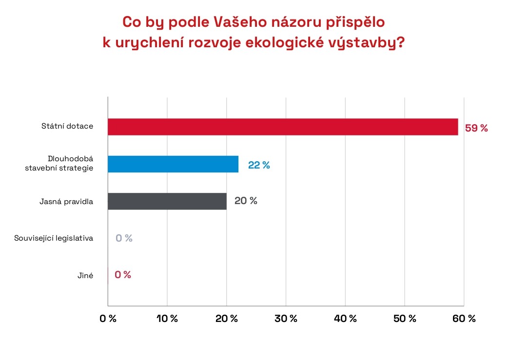 Náklady spojené s přechodem na udržitelné stavebnictví jsou vysoké. I proto by na 59 % dotázaných stavebních společností ocenilo státní dotace, které by s tímto přechodem pomohly. Podle pětiny dotázaných by pomohla i dlouhodobá stavební strategie (22 %) nebo jasná pravidla pro přechod k udržitelnému stavebnictví (20 %).