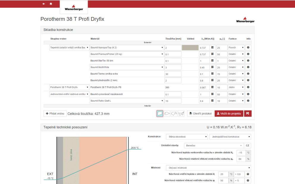 Vyvíjené řešení dále obsahuje doporučené skladby značek Porotherm, Tondach i možnosti úprav pro individuální řešení, automatický výpočet součinitele prostupu tepla, povrchové teploty a bilance vodní páry u všech skladeb, katalog objektů s možností výpisu prvků a doporučené ověřené konstrukční detaily. Všechna data jsou vždy aktuální a deklarována přímo od společnosti Wienerberger.