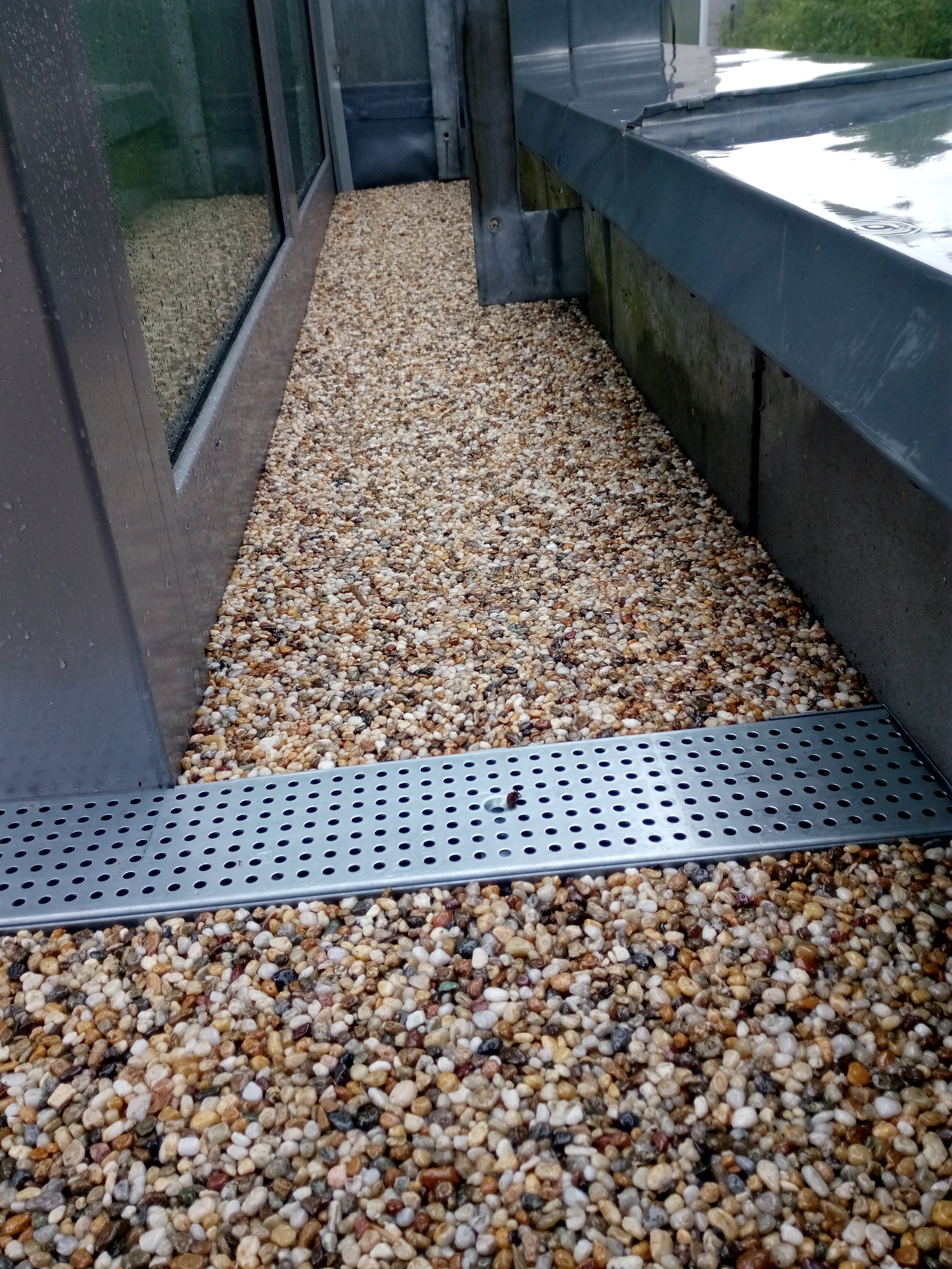 Žlaby z pozinkované nebo nerezové oceli jsou určeny pro odvodnění plochých střech, teras a ploch s obrácenou konstrukcí, kdy izolace je provedena až pod vrchní pochozí vrstvou.