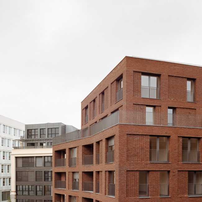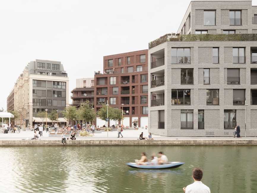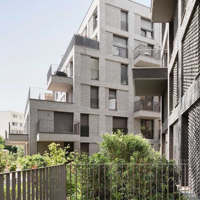 Ve francouzském Pantinu, severovýchodním předměstí Paříže, postavila architektonická kancelář Avenier Cornejo architectes tři budovy u kanálu Canal de l’Ourcq. Zahrnují celkem 88 bytů, jsou uspořádány do půlkruhu a uzavírají malé nádvoří, které ústí ke kanálu. Třetí blok se nachází na západní straně ulice: Má o jedno podlaží navíc a komerční prostory v přízemí. Všechny tři budovy mají zhruba stejné proporce, ale jejich design je dán tvarem pozemku a orientací ke kanálu. Ručně tvarované cihly byly kladeny v natahovací vazbě s dutými spárami. Okenní části jsou osazeny v kontrastní vlámské vazbě, přičemž čelní cihly jsou poněkud zapuštěné, aby vytvářely reliéfní efekt. Architekti zvolili tři barvy cihel jako moderní reakci na světle žlutou barvu mlýnů Grands Moulins de Pantin, postavených v roce 1884, které se nacházejí jen o něco dále na západ podél kanálu. Také kov použitý na okenní rámy a zábradlí má na každém bloku jinou barvu: Červené cihly doplňují šedé kovové detaily, světle šedé cihly zelené prvky a tmavě šedé cihly hnědé. Stejné cihly byly použity také na vydláždění cesty, která se klikatí mezi starými stromy v zahradě. Soubor je zdařilou syntézou jednoty a rozmanitosti.