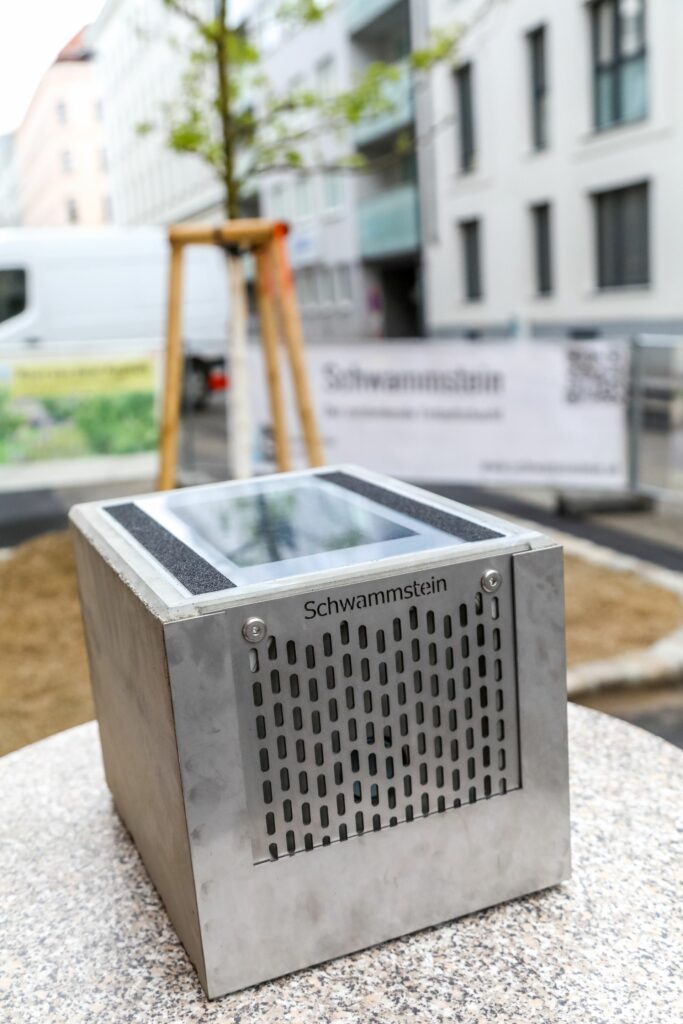 Novinky si na první pohled většina kolemjdoucích nebo projíždějících nejspíš ani nevšimne, mezi obrubníkovými kameny totiž nijak zásadně nevybočuje. Speciální betonový kvádr se zabudovanou technikou nazývá vídeňská radnice „Schwammstein“ neboli houbovitý kámen. Uvnitř hranatého tělesa se nachází ventil ovládaný senzory a řídící elektronickou jednotkou, která se stará o automatizované otevírání a uzavírání průtoku z ulice k zeleni. Senzor reaguje na vodu a po předem definovaném čase otevře ventil.