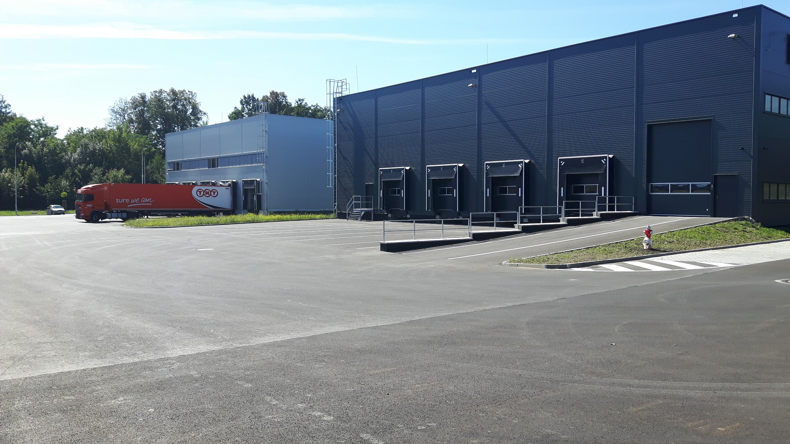 Distribuční centrum společnosti TNT Express Worldwide tvoří na ploše 1400 m2 také dvoupodlažní administrativní budova s kancelářským a sociálním zázemím. Nosná konstrukce je železobetonová, prefabrikovaná, fasádní plášť je ze sendvičových minerálních panelů. „Objekt slouží jako tranzitní depo, proto je vstup zajištěný pomocí 10 sekčních vrat se sklopnými můstky pro dodávkovou dopravu. Na východní straně je umístěno 5 vrat pro kamionovou dopravu. Součástí vrat je hydraulická vyrovnávací plošina osazená v podlaze,“ říká Tomáš Hess, obchodní ředitel společnosti HSF System, která byla generálním dodavatelem objektu.
