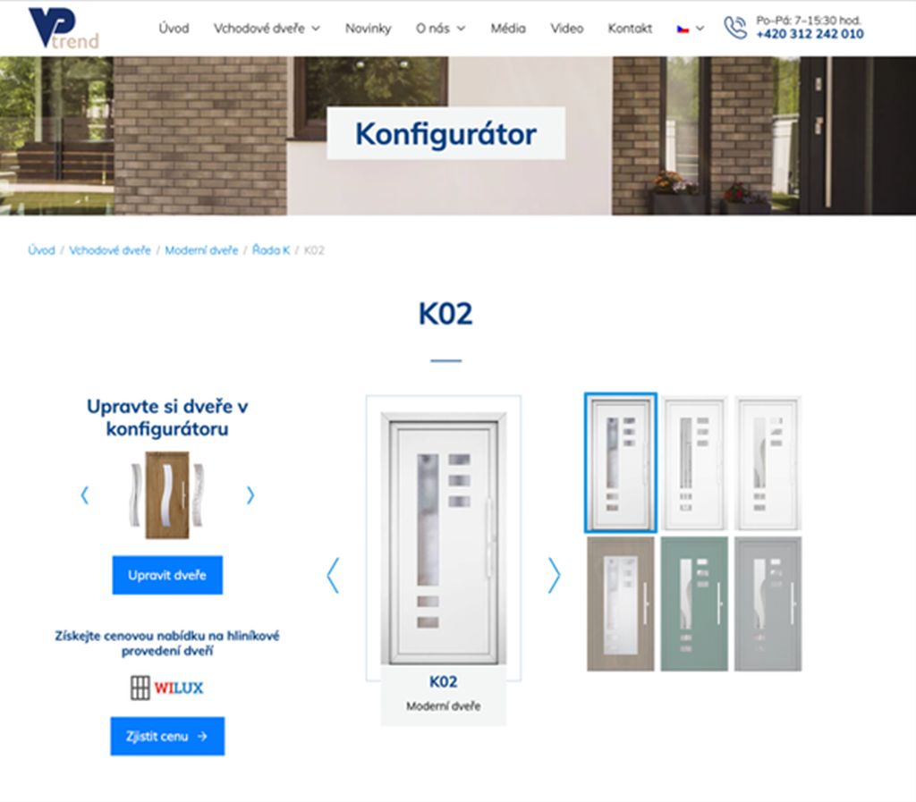 Díky webovému konfigurátoru si můžete nadefinovat dveře přesně podle vašich potřeb a představ. „Kvalitní vchodové dveře z profilových systémů jsou vždy vyráběny na míru konkrétnímu zákazníkovi,“ říká Stanislav Obyt, obchodní ředitel společnosti VP trend a dodává: „Na našem webu si tak zákazník může z katalogu vybrat jakýkoli typ dveří, u něj kliknou na tlačítko ‚upravit dveře‘ a tím vstoupí do konfigurátoru.“