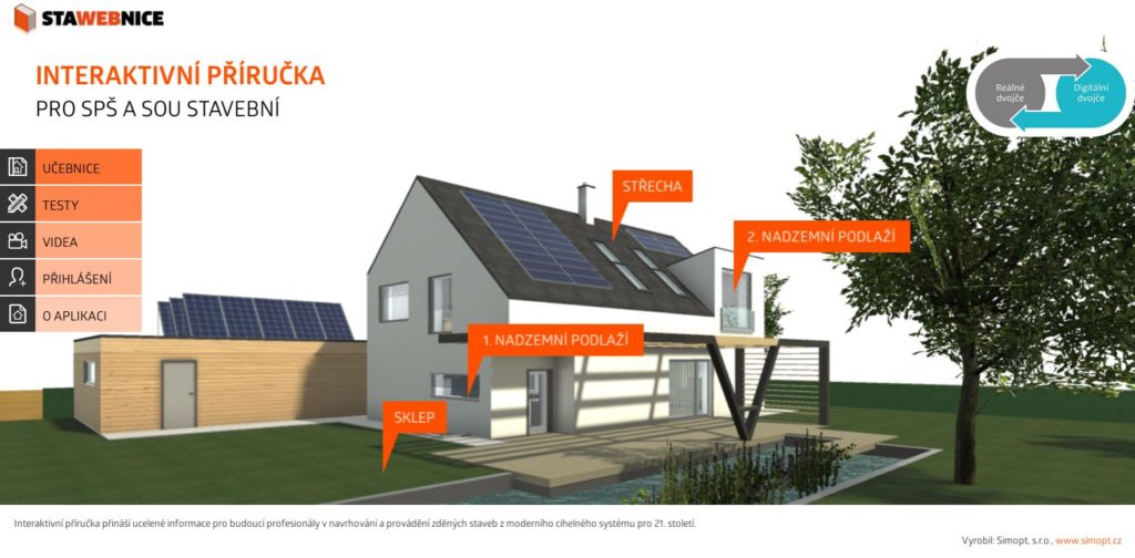 Interaktivní příručka STAWEBNICE je určena především studentům a učitelům středních průmyslových škol a středních odborných učilišť stavebních, ale je dostupná i pro všechny zájemce o stavební obor. V aplikaci naleznete zpracované kapitoly s tématikou stavebnictví, základní testy k jednotlivým kapitolám, edukační videa a v neposlední řadě 3D model nulového domu. Učitelé poté mají možnost přes systém pro učitele do aplikace vytvářet vlastní obsah a testy, které rychle ověří znalosti studentů.