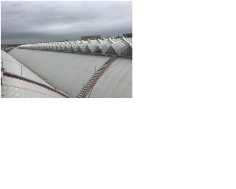 Součástí rozsáhlé rekonstrukce objektů Hlavního nádraží v Praze bylo i ocelové zastřešení haly nad nástupišti. Práce na opravách střechy byly rozděleny do několika etap, nejdříve byla ocelová konstrukce pískována, opatřena nátěrem a osazená zasklením. Následně probíhala montáž kompozitních roštů a plných krytů na stávající obslužné ocelové střešní lávky. Oprava ocelového zastřešení probíhala pod vedením společnosti Metrostav od roku 2015 do září 2017. Zhotovitel zakrytí kompozitním materiálem byla společnost MEA Water Management s.r.o.
