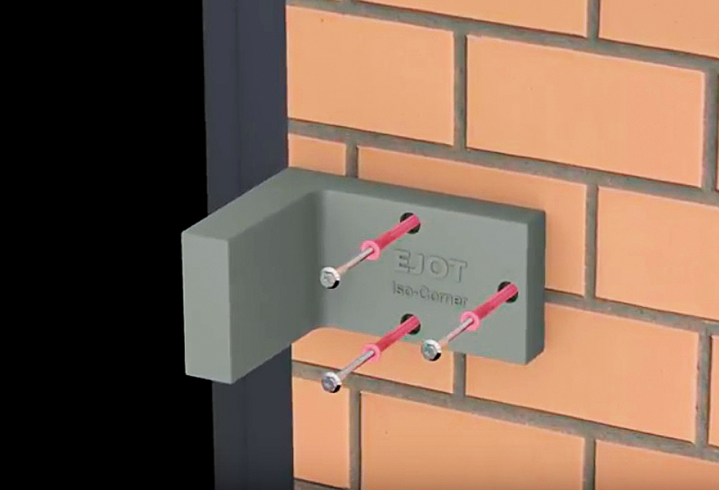 Upevňovací prvek EJOT Iso-Corner je určen pro plánovanou montáž středně těžkých i těžkých dílů do zateplených fasád ETICS s redukcí tepelného mostu. Upevnit lze pomocí tohoto úhelníku na fasádu nejen balkonová zábradlí, ale i rozměrné okenice, křídlové i posuvné, ale i konzole pro klimatizační jednotky nebo záchytné systémy. EJOT Iso-Corner se přizpůsobí tloušťce tepelného izolantu.