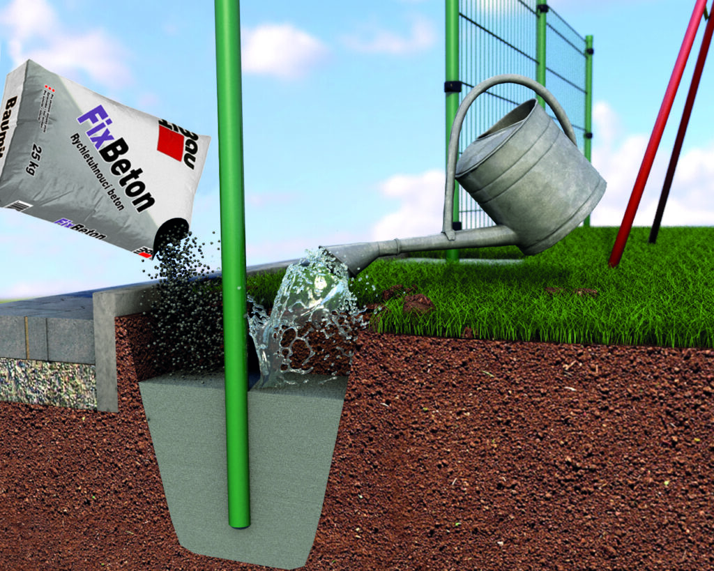Baumit FixBeton je tedy rychle tuhnoucí betonová směs pro všechny drobné stavební práce v domě i na zahradě spojené s ukotvením vybraných prvků v zemi. Na trh se dodává v zrnitosti 4 mm s třídou pevnosti C 16/20 dle normy EN 206-1. Její obrovskou předností (ale na druhou stranu také jistým úskalím) je počátek tuhnutí již po 10 minutách. Je tedy třeba pracovat s touto směsí poměrně rychle, bez časových prodlev a současně dodržovat určitá pravidla při jejím použití. Z pohledu pracovního postupu a následné zpracovatelnosti se nabízí dva způsoby, jak ukotvení realizovat. Více efektivním způsobem, např. při fixaci plotového sloupku, je rozhodně aplikace „bez míchání“. Do předem vyhloubeného a navlhčeného otvoru v zemi, který by měl být ve všech směrech o 25–30 cm větší než samotný rozměr sloupku (nebo kotevního prvku), nasypeme suchou směs ve vrstvě 10 cm a zalijeme předepsaným množstvím vody. Následně lze tento proces nasypání směsi a zalití opakovat až do požadovaného tvaru betonového kotvení, a nakonec ukončit zahlazením. Takto zalitá vrstva začíná tuhnout a tím částečně fixovat sloupek v požadované poloze již po zmíněných 10 minutách.