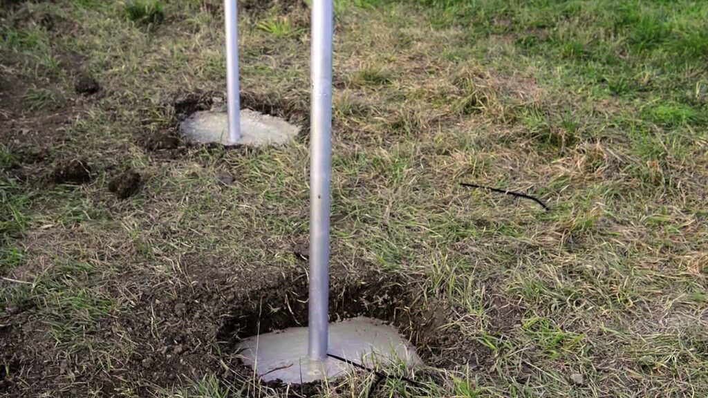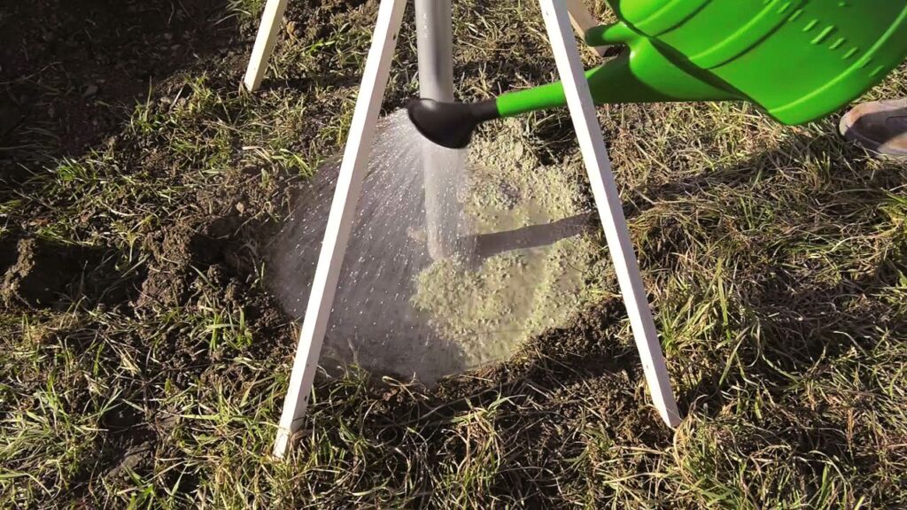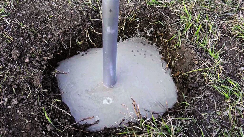 Při metodě s mícháním se předem připravená betonová směs nalévá do otvoru s usazeným sloupkem. Sloupek je možné lehce zatížit již po 30 minutách.