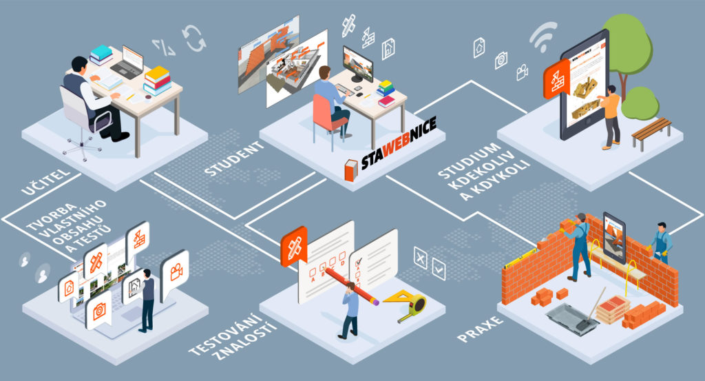 Informace o projektu STAWEBNICE naleznete na www.stawebnice.online, kde je aplikace dostupná zdarma ve verzi pro PC, Android nebo iOS. Vkládat vlastní obsah a testy do aplikace lze prostřednictvím systému pro učitele na ucitel.stawebnice.online. Online verzi interaktivní příručky Stawebnice naleznete na www.stawebnice.online/aplikace.
