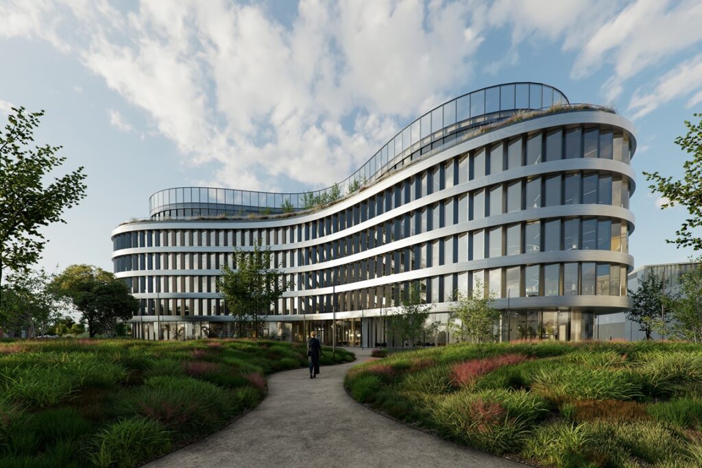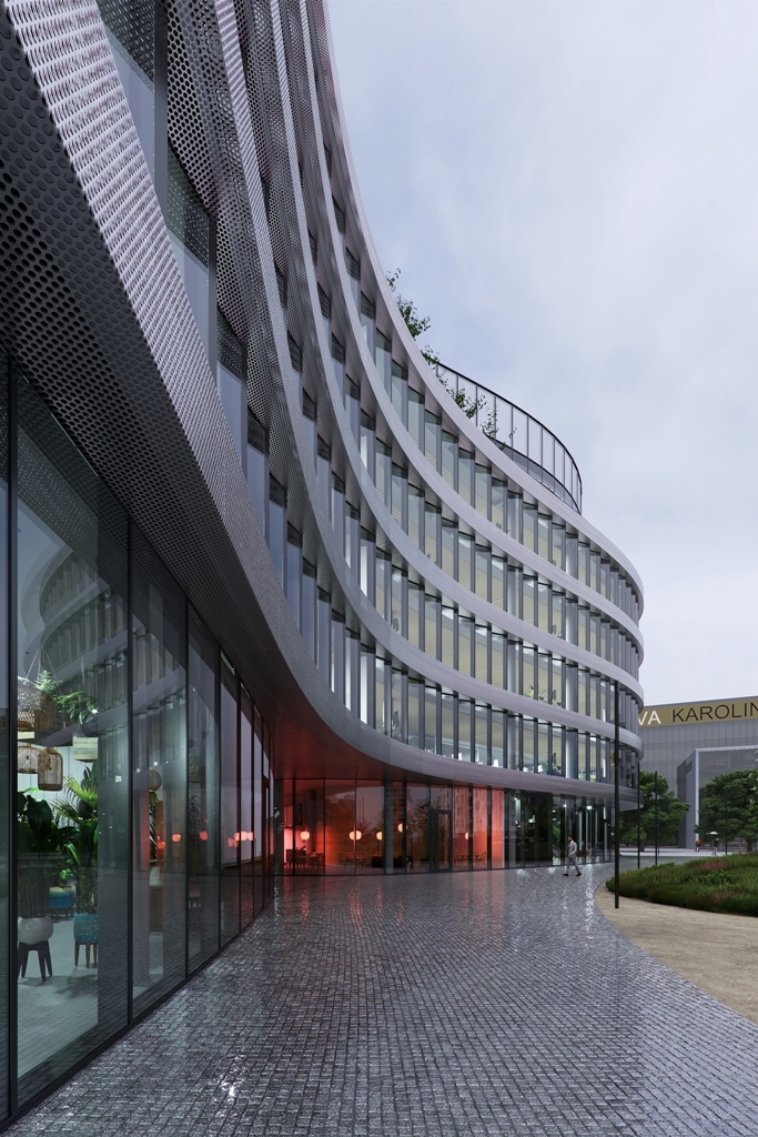 Organické tvary budovy se umně snoubí s industriálními prvky a nejmodernějšími technologiemi uvnitř. Fasádu tvoří skleněná okna s černými hliníkovými zalamovanými klapkami širokými půl metru a vysokými přes celé patro. Díky klapkám vypadá budova z různých úhlů odlišně. Mezi etážemi budou umístěny pásy z perforovaného plechu.