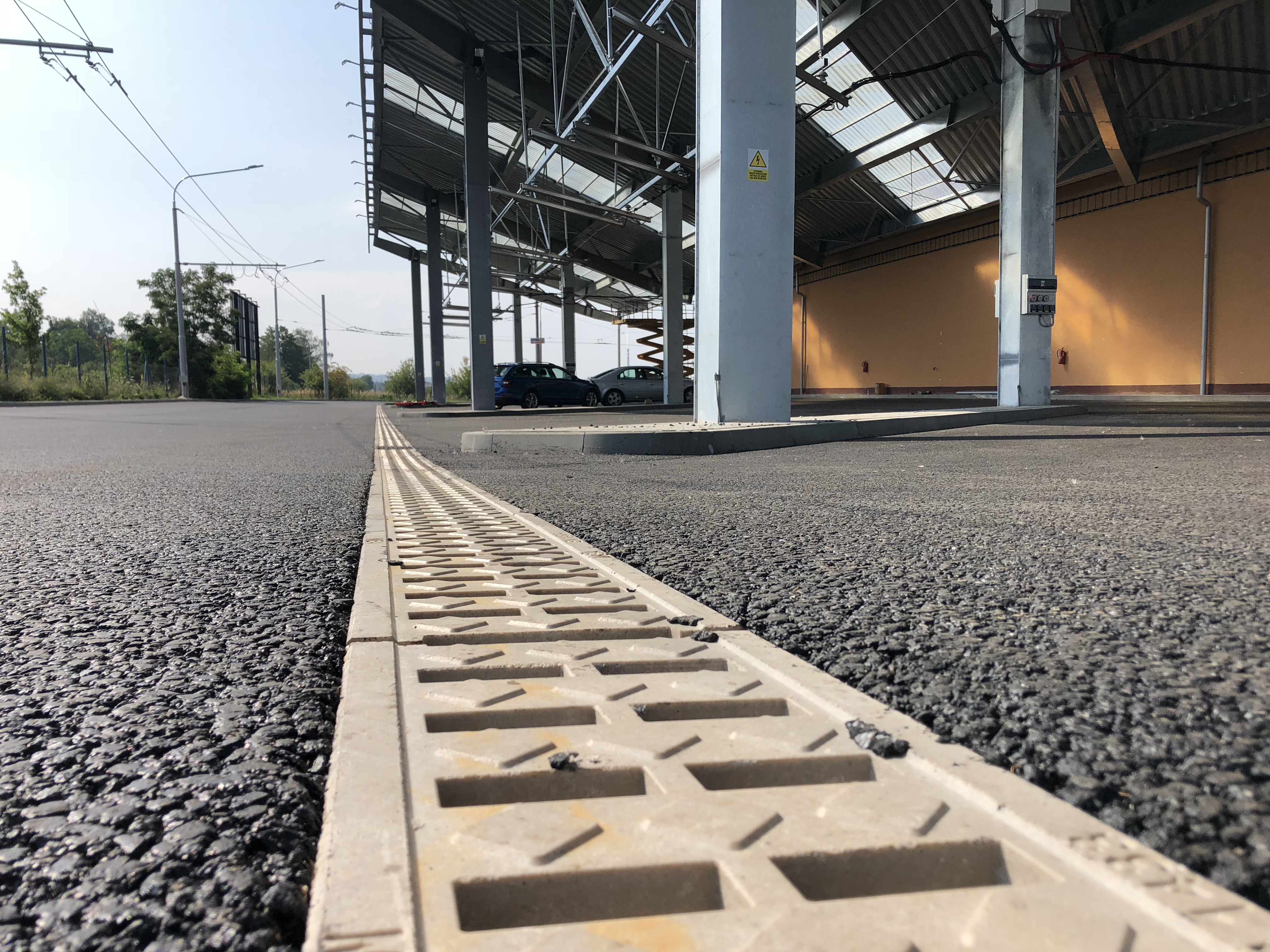 Monolitický žlab z polymerického betonu vydrží každou zátěž na silnici ve třídách A15 – F900 kN. Je určen pro dálnice, rychlostní komunikace i autobusové zastávky. Podle kapacitních požadavků se volí konkrétní šířka žlabu. V Českých Budějovicích byla zvolena šířka 2000 mm. Materiál polymerického betonu velice dobře odolává také posypovým solím.