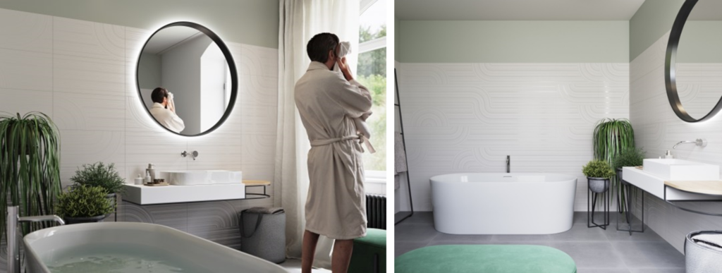 •             rektifikované obkládačky 30 x 60 cm – dekory s liniovým vzorem, se kterými se dají vytvářet unikátní vzory na každé stěně v černé a bílé barvě