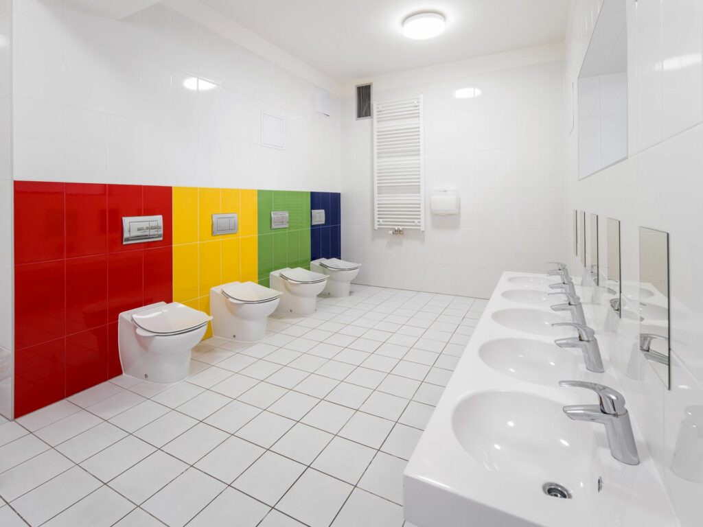 Celkově prostředí školky odpovídá severské filozofii: Je bohaté na podněty, ne však přetížené. V tomto duchu se uplatnily i keramické obklady české značky RAKO, která s YIT dlouhodobě na projektech spolupracuje. Podlahu haly s centrálním schodištěm i samotné nášlapy schodů tvoří neglazované slinuté dlaždice RAKO v designu hrubozrnného betonu a cementu ze série Piazzetta v odstínu světle šedé. Stěny umývárny a sociálních zařízení pokrývají keramické obkládačky Color One. Jsou v zelené, modré, žluté a červené barvě, čímž odkazují na barvy v přírodě, mech v lese, vodu, slunce, květiny. Jinde je bíle obložená stěna vtipně doplněná barevnými variantami tvořícími pruhy. Na podlahách se uplatnily dlaždice série Color Two.